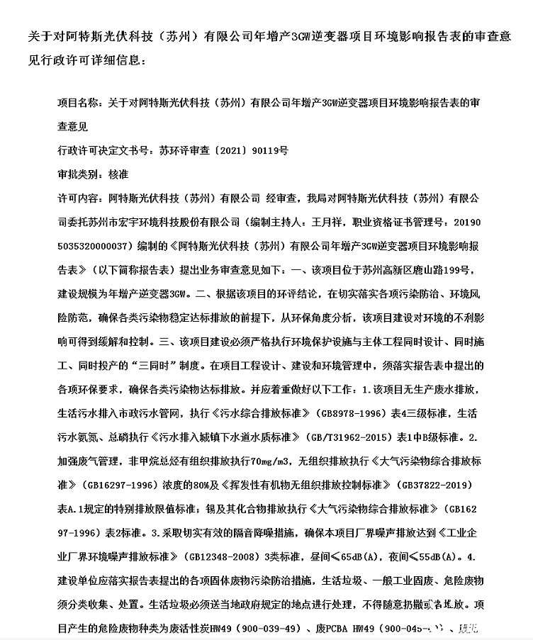 阿特斯光伏科技(蘇州)有限公司年增產3GW逆變器項目環境影響報告表建設單位公示